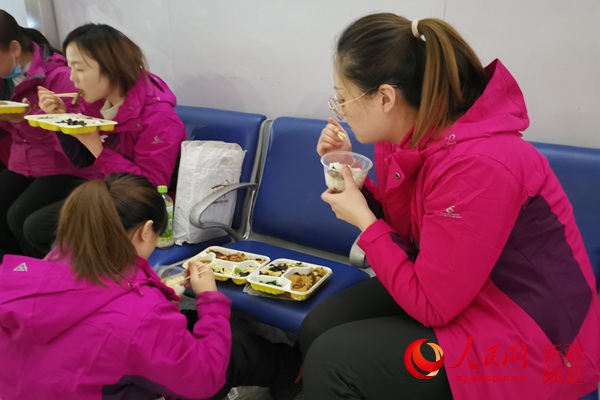 從全疆5個地州市多家醫院抽調的護理人員在機場匆匆吃晚飯。