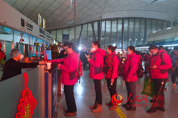 新疆第二批援鄂醫療隊快速通過綠色通道準備登機。
