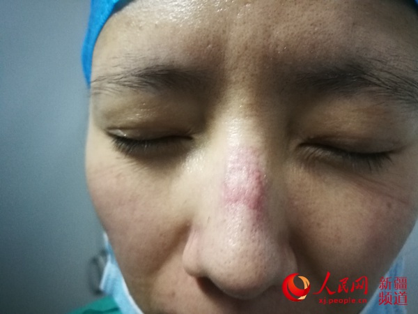 長時間佩戴口罩和護目鏡給吳晶的鼻梁造成二期壓力性損傷。