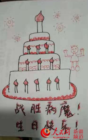 前幾天,病區里一位老人過生日,這里沒有生日蛋糕,也沒有家人陪伴,為了不讓老人感到孤獨,我們醫護人員一起為他策劃了一個別樣的生日。一位同事在紙上畫了一個生日蛋糕,我們把這個特別的“蛋糕”拿到老人床前,一起為他送上生日祝福。