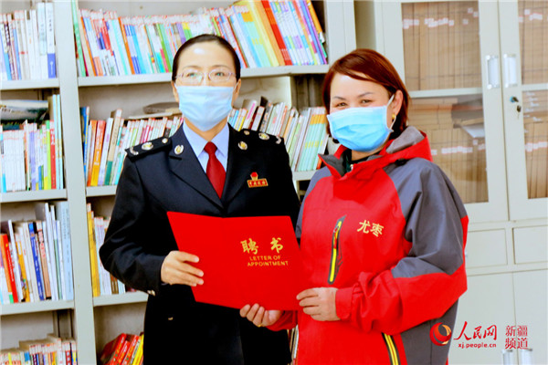 稅務干部向全國人大代表尤良英發放聘書。鄭軍 攝