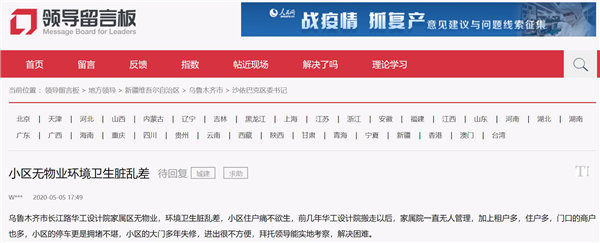 5月5日,一名網友向沙依巴克區委書記留言稱,烏魯木齊市長江路華工設計院家屬區無物業,環境衛生臟亂差,小區住戶痛不欲生。前幾年,華工設計院搬走以后,家屬院一直無人管理,加上租戶多,住戶多,門口的商戶也多,小區的停車更是擁堵不堪,小區的大門多年失修,進出很不方便,拜托領導能實地考察,解決困難。