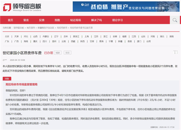 4月10日,一名網友向克拉瑪依市委書記趙文泉留言稱,本人去世紀家園小區辦事,期間在地下車庫停車1小時,出門收費10元,收費人員告知半小時5元,現在自治區28項措施中有一項就是免收小區居民2個月停車費,不但沒有執行惠民政策,而且費用標準如此高,請有關部門給予落實。