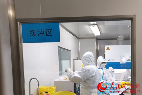 抵達烏魯木齊的當晚,湖北核酸檢測醫療隊的隊員很快準備就緒,穿上防護服、戴好護目鏡、口罩、手套、腳套,全副武裝進入了實驗室,F在正值暑熱天氣,穿著厚重防護服的檢測人員在實驗室一干少則6小時,多則10小時,悶熱程度可想而知,但是為了讓當地的疫情防控指揮部第一時間得知結果,這些苦他們毫不在意。