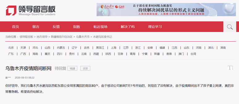 網絡通信暢通是關乎千家萬戶的民生問題,有不少網友在人民網《領導留言板》新疆板塊留言,反映疫情防控期間電信運營商網絡通信問題。