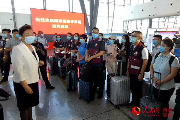 自治區黨委常委、宣傳部部長田文前往機場送行,并代表自治區黨委、自治區人民政府,對專家組表示衷心感謝,致以崇高敬意。她表示:“在新疆各族群眾遭受疫情打擊的關鍵關頭,你們帶著黨中央的親切關懷、帶著兄弟省市的深情厚誼,第一時間趕赴新疆,帶著我們干、堅守一線干,與我們生死相依、并肩戰斗。你們這種頑強拼搏、無私援助、醫者仁心的崇高精神,讓我們倍感溫暖、深受感動!