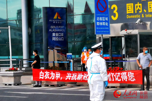 烏魯木齊機場航站樓前拉起橫幅為國家援疆專家組送行。馬亮 攝