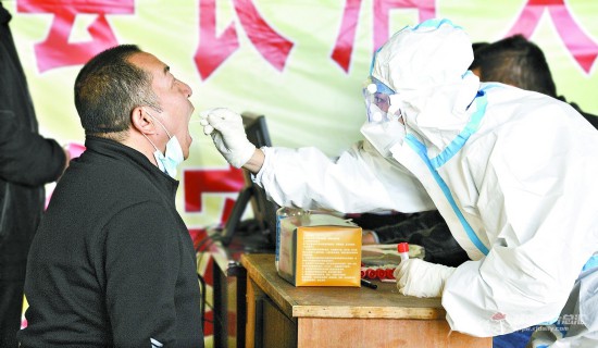 11月2日,醫務人員在喀什市庫木代爾瓦扎街道解放南路社區進行核酸采樣。約提克爾·尼加提 攝