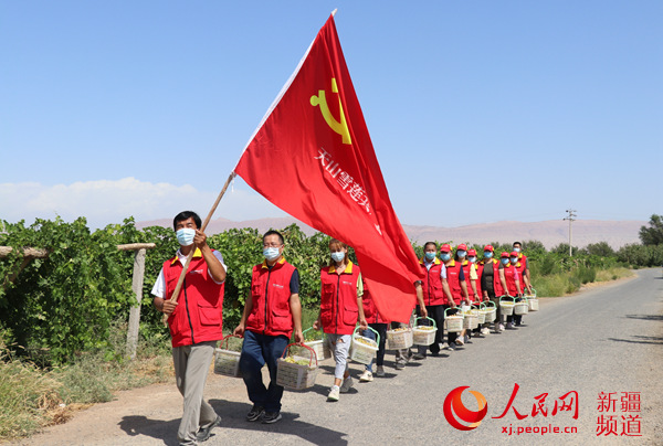 國網吐魯番供電公司“訪惠聚”黨員服務隊搬運葡萄至車輛裝卸點。