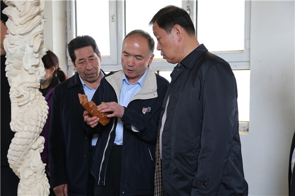 中國建設銀行新疆區分行黨委書記、行長徐軍世到貧困村木器木雕廠調研。中國建設銀行新疆區分行供圖