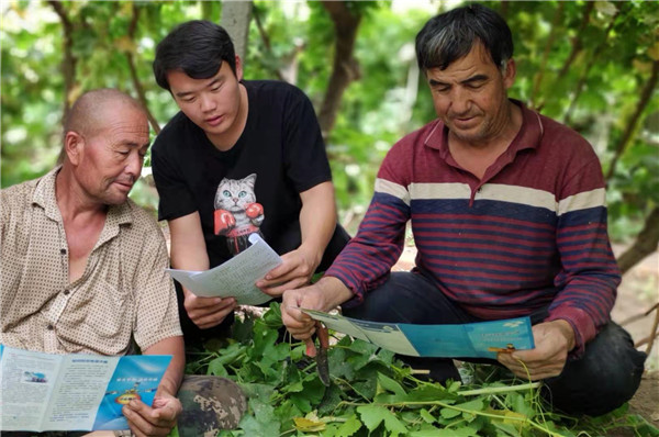 吐魯番分行勝金鄉分隊大學生來到田間地頭向葡萄種植戶開展金融知識宣傳。中國建設銀行新疆區分行供圖