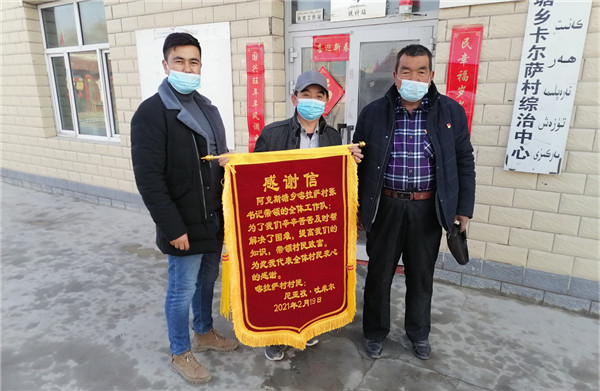 2021年2月24日早晨,喀拉薩村二組村民尼亞孜·吐米爾把一面印著“感謝信”的錦旗送到中國人壽保險股份有限公司阿克蘇分公司駐阿克吾斯塘鄉喀拉薩村第一書記張成林的手中,這面錦旗包含著喀拉薩村群眾三年來對工作隊的深深感謝之情。