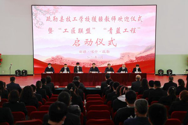 4月9日,山東援疆教師與受援地教師簽訂“工匠聯盟”“青藍工程”儀式在疏勒縣技工學校舉行,來自東營市技師學院和藍海職業學校支教的7名援疆教師與疏勒縣技工學校的20名青年教師簽訂了師徒結對協議書。