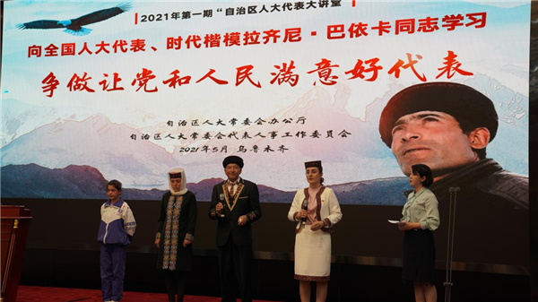 人民網烏魯木齊5月11日電(那衣)“好兄弟,你是帕米爾高原展翅翱翔的雄鷹,請你放心,你牽掛的那片高原,我們會繼續守護……”5月10日,在新疆人民會堂第一期“自治區人大代表大講堂”上,開巴奴·斯提卡達木、古麗白給木·夏夏、崔久秀、木沙江·努爾墩四位人大代表用樸實的語言、生動的事例、真摯的情感,作了一場感人至深、令人深思、催人奮進的演講。訴者悲痛,聞者淚目。