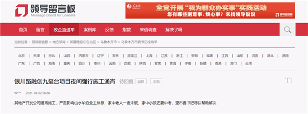 中高考在即,每當夜幕降臨各種各樣的噪聲不絕于耳,建筑工地通宵施工,這讓家住山水華庭的網友苦不堪言。網友留言稱:烏魯木齊市銀川路融創九璽臺項目的地產開發公司通宵施工,嚴重影響山水華庭業主休息,家中老人一夜未眠,小孩還要中考,望市委書記盡快幫助解決。