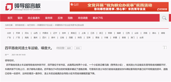 “烏魯木齊高新區(新市區)四平路夜間渣土車運輸導致夜間休息不好,車輛并排下行和上行,房子有震動,4月份重新鋪設的道路,由于渣土車超重且夜間行駛速度快,導致道路已有損壞,這樣的情況持續下去,會使小區市民夜間睡眠質量下降!