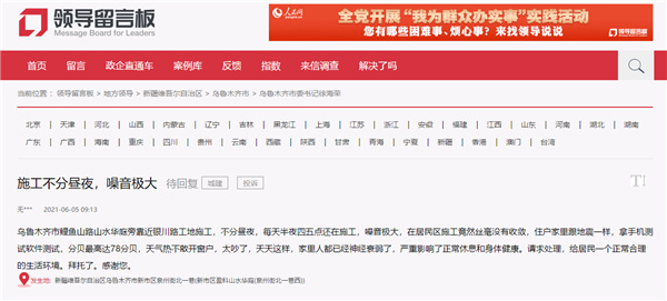 人民網烏魯木齊6月5日電 (李欣洋 馬安妮)噪聲污染是一項需要長期關注和整治的環境問題。建筑工地半夜施工,噪聲、燈光等污染嚴重,不少居民深受其擾。即將臨近中高考,噪聲污染格外敏感。近日,在人民網《領導留言板》新疆板塊中,不少網友留言呼吁工地、周邊建筑等場所作業時“聲音小一點”,為中高考護航。