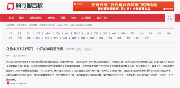 “烏魯木齊市天山綠洲小區,火車鳴笛不分時差,半夜常有火車鳴笛聲,2018年曾貼出整改通知,情況有所好轉,但很快又開始了,現在家里有了小孩,經常半夜被火車鳴笛聲吵醒,實在是沒法容忍,請領導重視,還我們一個寧靜的夜晚!