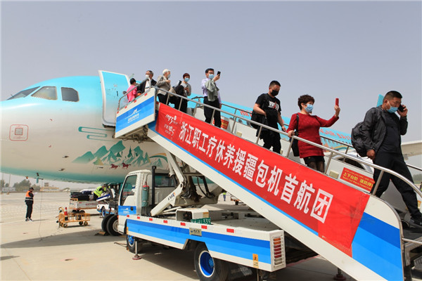 4月28日14時16分,乘坐“絲路古龜茲 神奇阿克蘇”主題彩繪飛機的“我愛浙疆”之“詩畫浙疆”百團萬人游——職工療休養援疆包機首航團平穩降落在阿克蘇機場,來自浙江的152名游客將在阿克蘇開啟5天的精彩旅程。該旅游援疆包機系今年疆外首趟旅游包機,群體包括來自浙江的職工療休養對象和網紅、媒體、旅游達人等,屆時將搭建網上直播平臺,和大家一起分享大美阿克蘇的風土人情。(李欣洋 劉雪嬌)