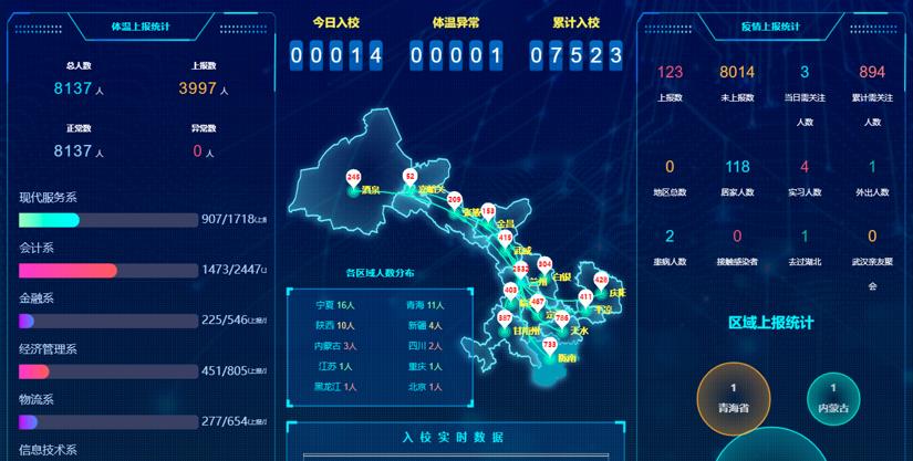 新冠疫情防控對于院校非常重要,在“數字新校園”微信小程序中為學校定制開發了“新冠疫情上報”“疫情期間簽到位置上報”等功能。通過疫情防控大數據分析,多維度、分階段匯總展現疫情期各類上報數據,形成直觀、詳細的大數據分析報表,使教師能夠實時掌握學生健康動態。當新生完成第一步個人信息核實與補錄后,根據學校疫情防控要求,平臺提供新生在家每日出行、健康狀態上報功能,便于學校在開學前對新生健康狀態的監控。