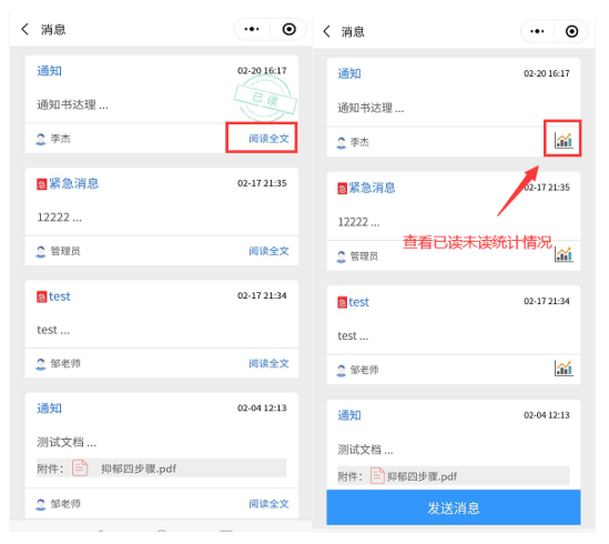 “數字新校園”中的“群組消息”服務滿足了校園師生隨時接收、互通校園消息的需求,特別是新入校同學的需求。作為學校與學生之間,教師與學生之間,學校與教師之間的消息通知傳達通道,群組消息分為學生群、教師群、職工群,消息單向發送,接收者不能回復,解決消息被回復語淹沒的問題,同時消息發送者可查看消息已讀未讀人員統計,以便發送者掌握消息送達情況。