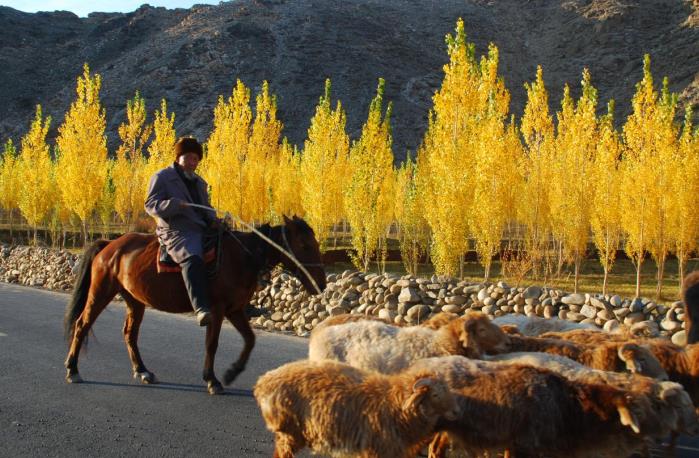 9月的可可托海,如一幅濃墨重彩的油畫,金黃色的白樺林為主色調,綠色、紅色、橙色等顏色的樹木、灌木和果實點綴其中,額爾齊斯河穿流而過,又添了一份動感。此外,目前正是轉場的季節,游客還可以觀看到轉場的壯觀場景。