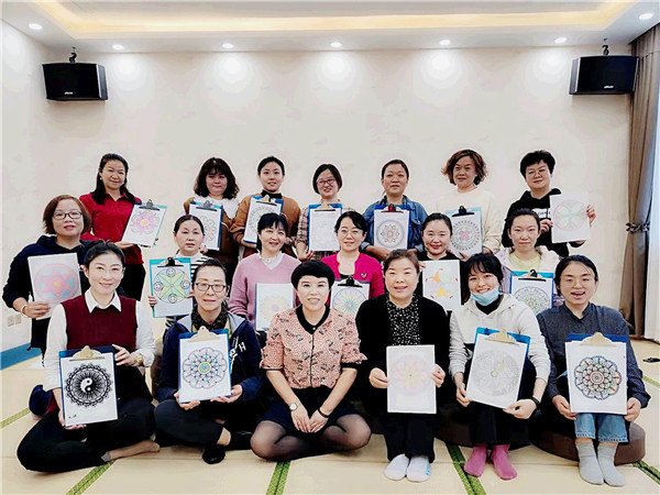 培訓課上,國家二級心理咨詢師曾莉婭老師首先通過“尋找有緣人”環節慢慢引導大家認識和了解彼此。緊接著在舒緩而又悠揚的音樂聲中,大家進入減壓培訓的第一階段:“繪畫藝術心理——靜心曼陀羅”,曾老師通過大家描繪出的心中最美的曼陀羅以及分享繪畫時的感悟,幫助大家分析解讀個性特點,給予心靈啟發。第二階段的“沙盤藝術表達——遇見未知的自己”體驗活動讓大家開啟了心扉:大家閉上雙眼,合著細絲游走般輕揚的小調,靜心感受著細沙流過手心的溫柔與親切,輕輕聆聽心靈的聲音和對話。在以“沙畫創作”“創意沙盤故事”“認識自我”為主題的不同環節中,大家從豐富多樣的沙具中挑選自己看中和喜歡的模型,一起構筑出一幅幅美麗的圖畫,共同暢想幸福生活,描繪美好的未來。大家跟隨著曾老師的引導,互動頻繁,笑聲不斷。