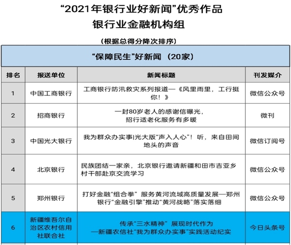 1月12日,中國銀行業協會發布“2021年中國銀行業好新聞”獲獎名單,新疆農村信用社聯合社報送的《傳承“三水精神” 展現時代作為——新疆農信社“我為群眾辦實事”實踐活動紀實》榮獲金融機構組“保障民生”好新聞,為新疆金融機構唯一獲獎的作品,這也是繼新疆農信在獲評2020年中國銀行業好新聞獎后,又一次獲得這一行業宣傳領域的最高獎項。