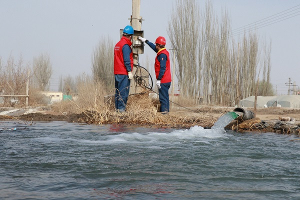 2021年3月20日,國網沙雅縣供電公司員工在沙雅縣古勒巴格鄉二農場為春灌用戶檢查用電設備。常帥 攝