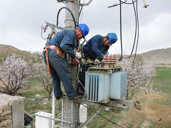 2021年3月21日,國網拜城縣供電公司員工在拜城縣亞吐爾鄉杏花村更換機井供電專用變壓器,滿足該村春耕春灌用電負荷需求。馬海驕 攝
