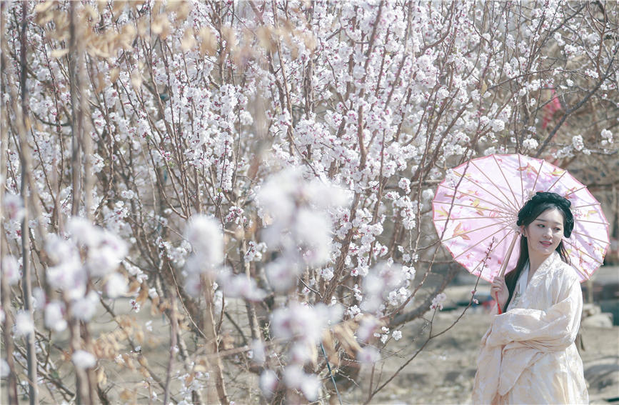 天氣漸暖,吐魯番杏花進入盛花期,游客享受美好春光。田園攝
