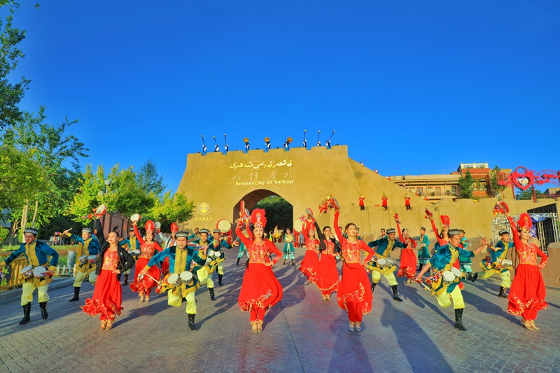 在喀什古城,演員們載歌載舞歡迎疆內外游客。米爾扎攝