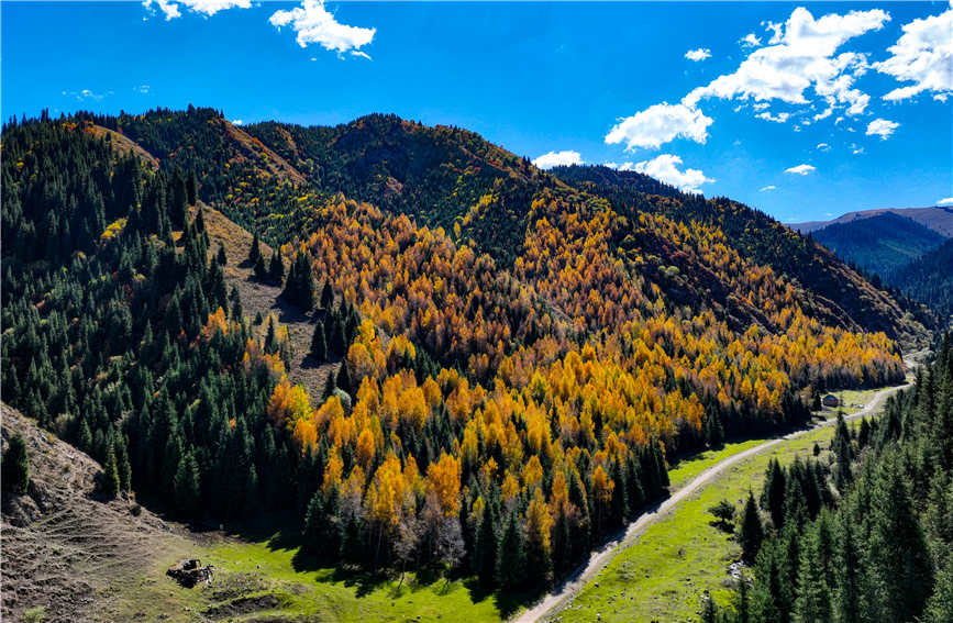金秋九月,走進新疆伊犁哈薩克自治州昭蘇縣薩爾闊布鄉的多浪峽谷,眺望前方的雪松林,呈現出一片色彩斑斕的景象,黃色的白樺樹、紅色的灌木與綠色的松林產生了令人驚艷的撞色之美。
