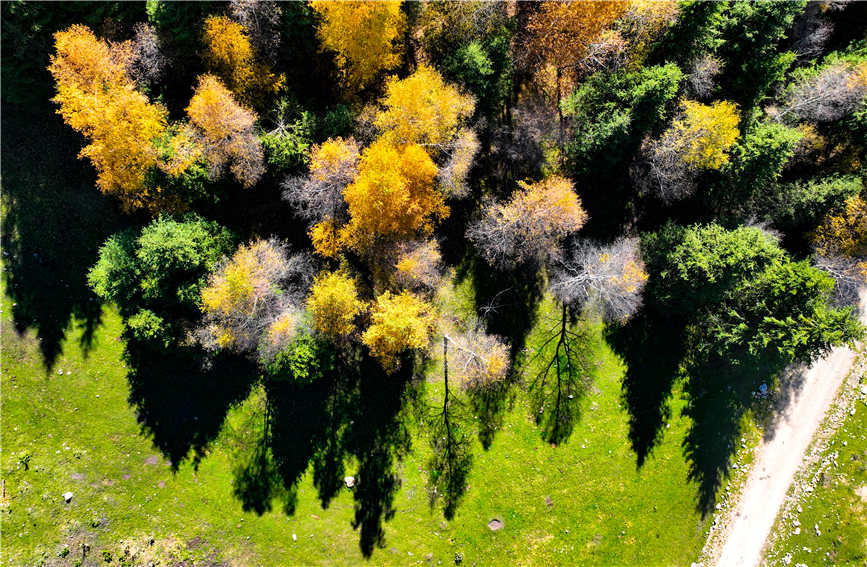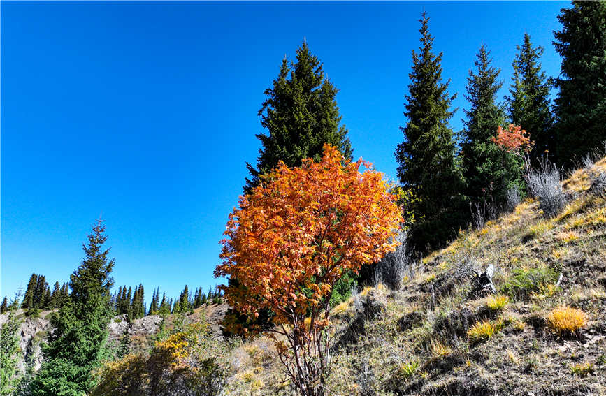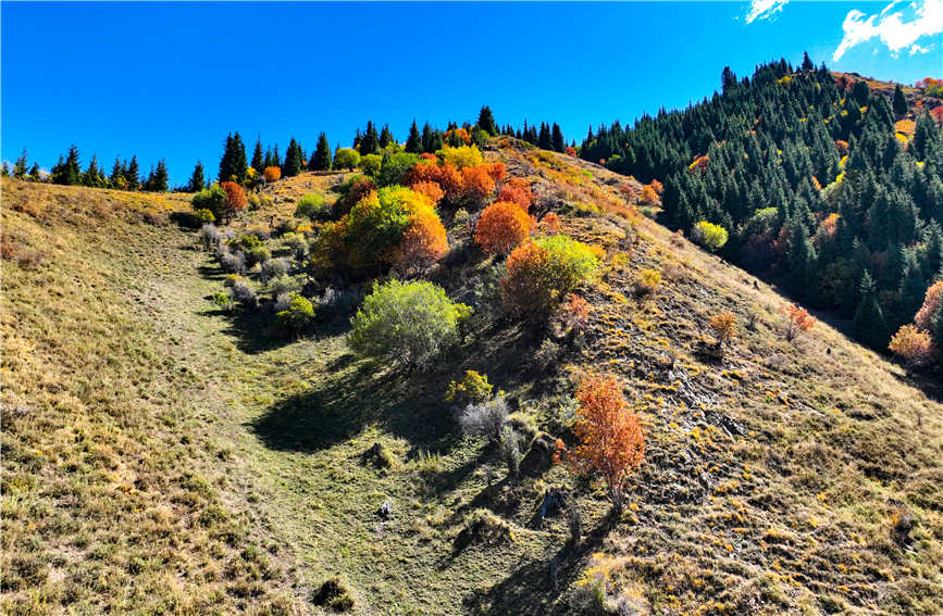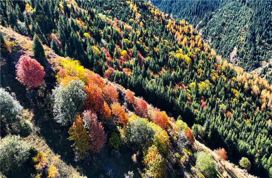 多浪峽谷位于昭蘇縣天山木扎爾特冰川北坡,是一片原始森林,多種植物交錯生長。因樹種不同,山坡上呈現出美麗的秋景。(李龍)