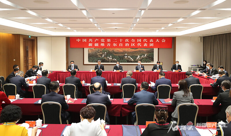 10月15日,出席中國共產黨第二十次全國代表大會的新疆維吾爾自治區代表團舉行全體會議。天山網-新疆日報記者 崔志堅攝