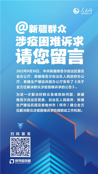 為進一步解決好群眾急難愁盼問題,新疆維吾爾自治區黨委、自治區人民政府、新疆生產建設兵團及各地州市(師市)建立全方位解決群眾涉疫困難訴求協調聯動工作機制,加大督辦問效力度。群眾遇到生產生活困難訴求,可通過人民網“領導留言板”進行反映,把您的困難事、煩心事說一說。