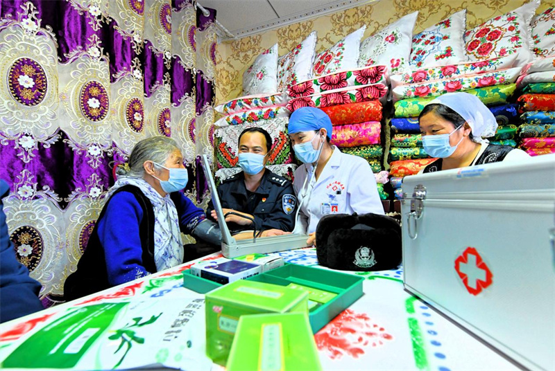 “送醫送藥送物資服務隊”為偏遠牧區牧民群眾檢查身體。周游攝
