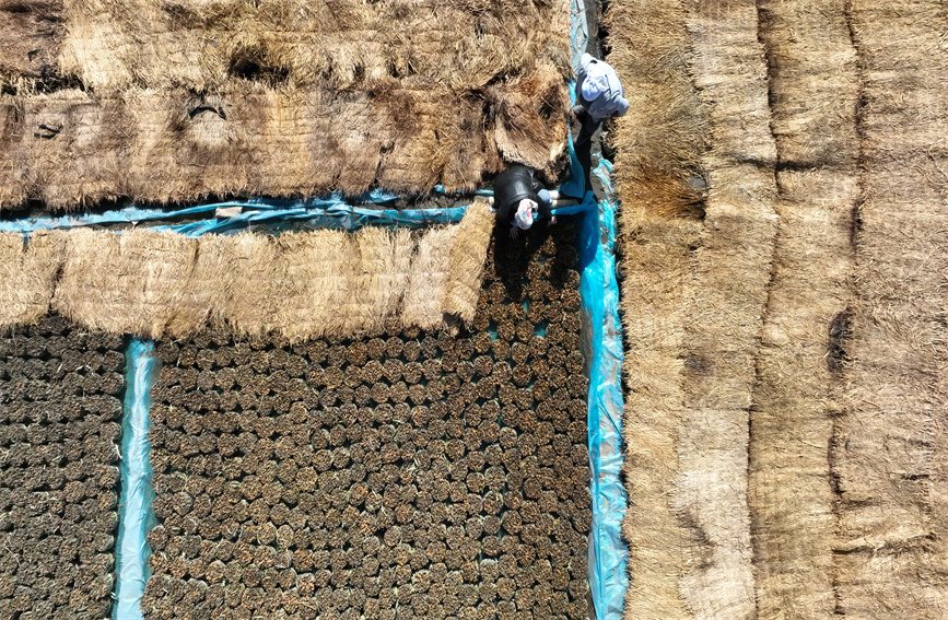 焉耆縣七個星鎮的村民對沙棗苗進行打包。確·胡熱攝