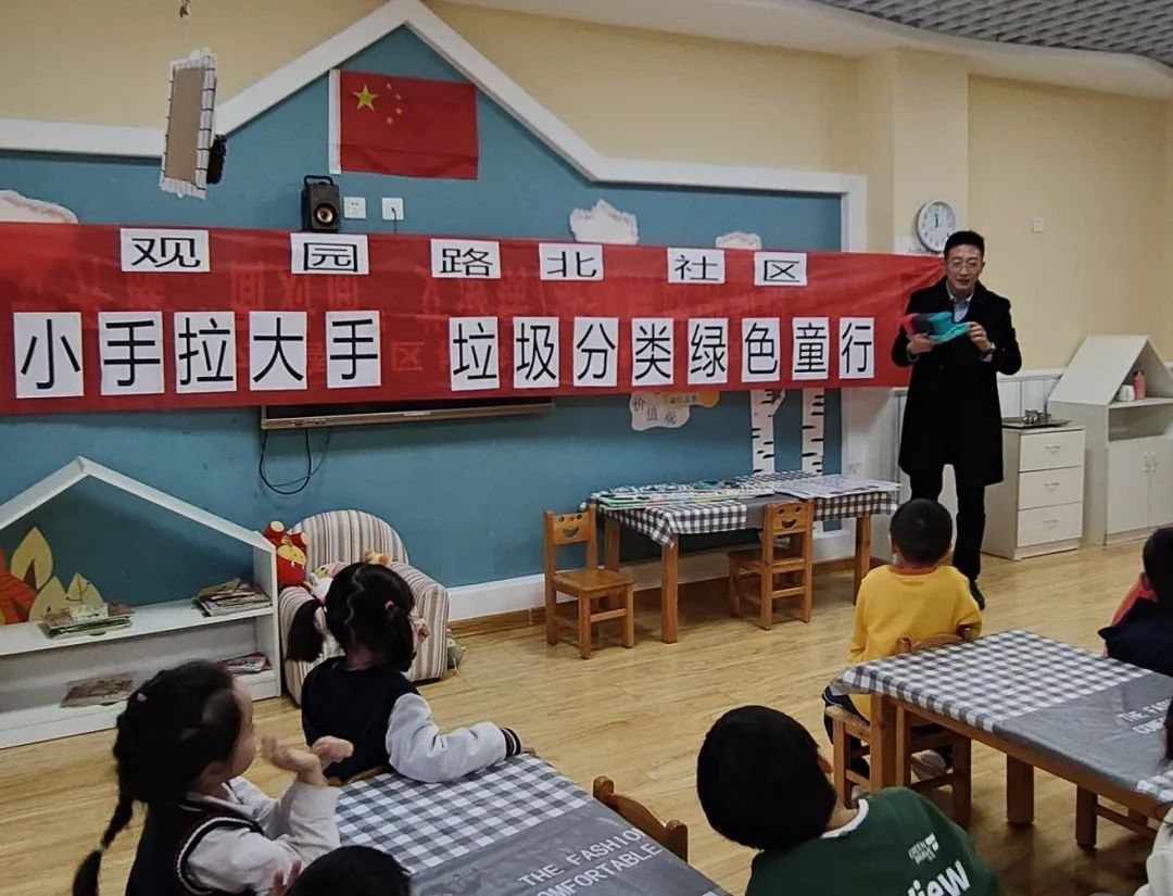 近日,河馬泉街道觀園路北社區聯合海唄爾森林幼兒園開展“小手拉大手 垃圾分類綠色童行”主題宣傳活動。