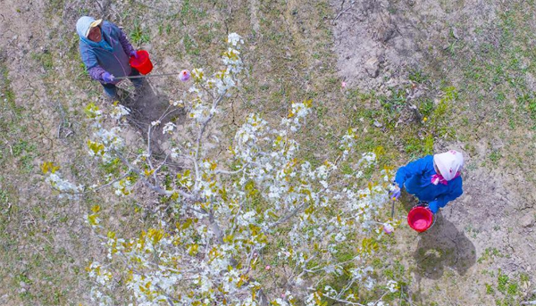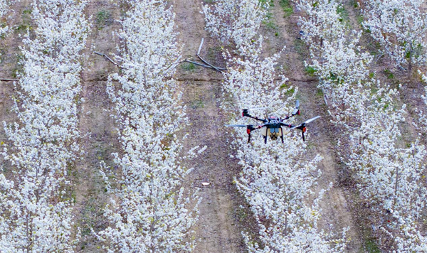 4月16日,在二十九團十連職工盛恩光的梨園里,雪白的梨花成片開放,梨園上空,一臺無人機正在執行液體授粉作業,演繹智慧農業種植新模式。