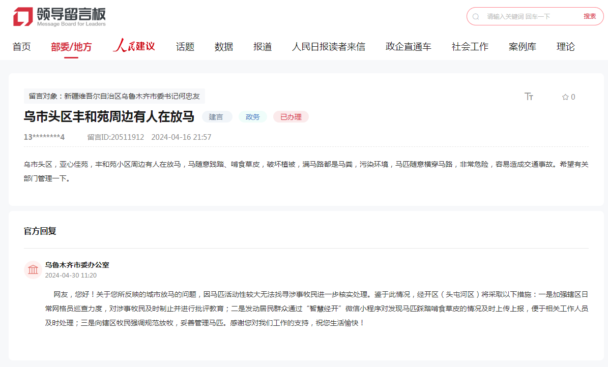 針對該網友留言,烏魯木齊市委辦公室進行回復:對于網友所反映的城市放馬的問題,因馬匹活動性較大無法找尋涉事牧民進一步核實處理。鑒于此情況,下一步烏魯木齊經開區(頭屯河區)將采取以下措施:一是加強轄區日常網格員巡查力度,對涉事牧民及時制止并進行批評教育;二是發動居民群眾通過“智慧經開”微信小程序對發現馬匹踩踏啃食草皮的情況及時上傳上報,便于相關工作人員及時處理;三是向轄區牧民強調規范放牧,妥善管理馬匹。
