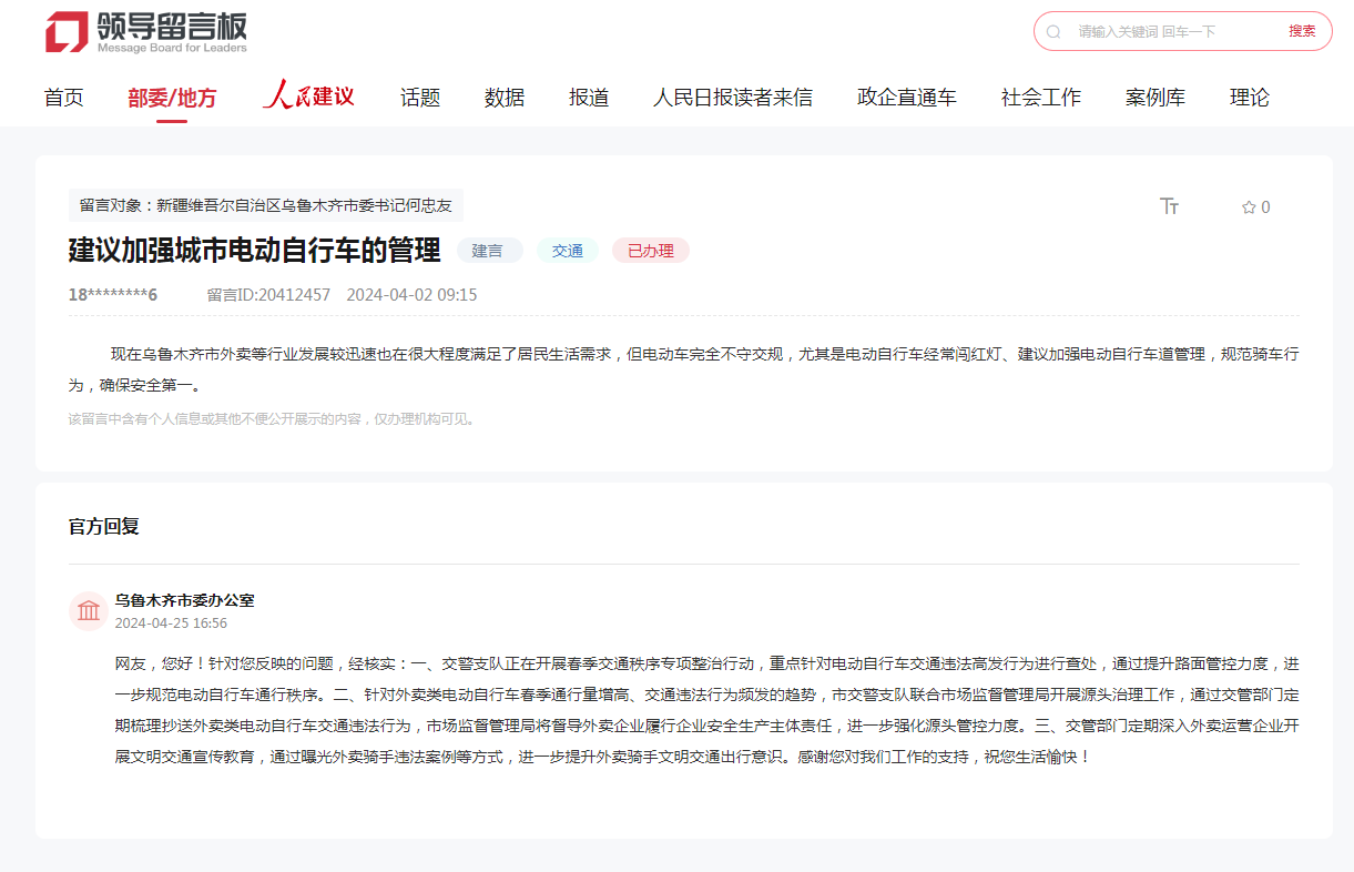 接到留言后,烏魯木齊市委辦公室對該條留言積極回復,回復稱:當前,交警支隊正在開展交通秩序專項整治行動,重點針對電動自行車交通違法高發行為進行查處,通過提升路面管控力度,進一步規范電動自行車通行秩序。