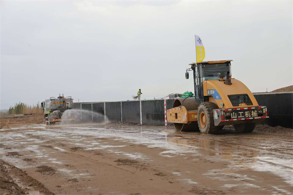 近日,在二師G0711高速互通—二十一團—二十六團公路項目第一合同段建設現場,工程車輛來往穿梭,壓路機、液壓夯正在涵洞兩側作業,工人們各司其職,有序施工,呈現出一派熱火朝天的建設場景。