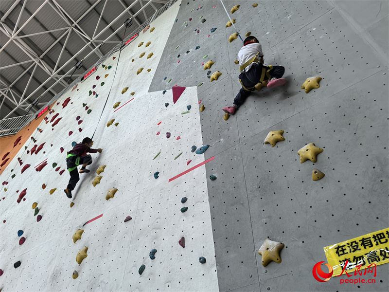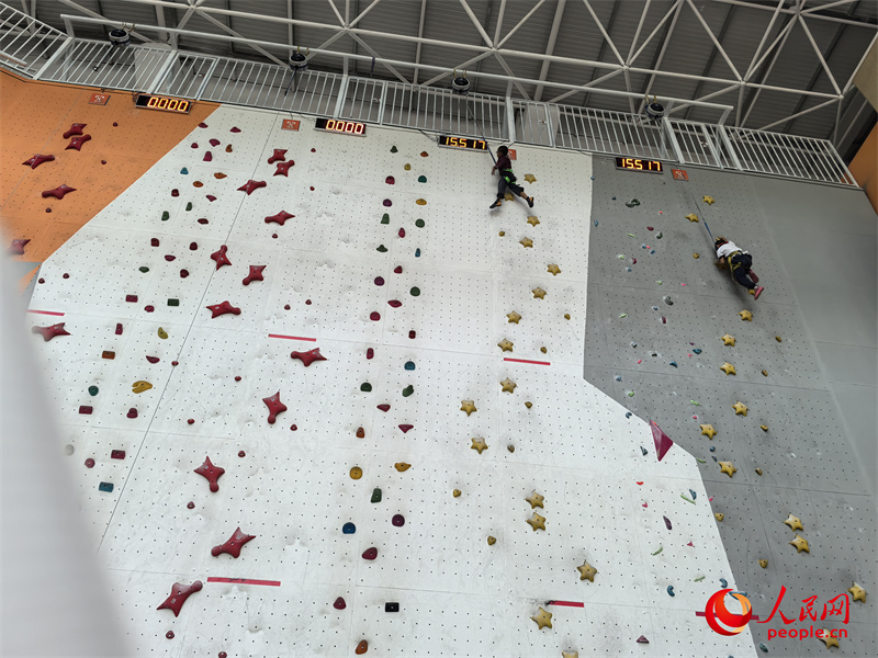 攀巖社團課上,陳泓霖和同伴比試。人民網記者 陳新輝攝