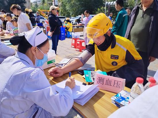 公益活動在位于新民東街的七一商圈舉辦,現場的義診服務邀請了自治區康復醫院的醫生提供免費號脈、內科專家看診、測血壓、測血糖、宣教健康保健知識、康復科專家看診及治療、眼科主任檢查眼鏡等項目,還為“兩企三新”就業群體準備了秋季預防感冒的茶飲包。