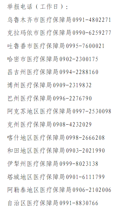同時,新疆維吾爾自治區醫療保障局公布了自治區及各地州市醫療保障局舉報電話。