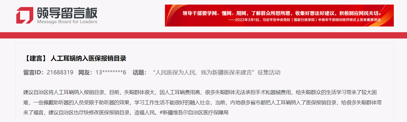 近日,一新疆網友通過“領導留言板”新疆醫保版塊建言表示,希望新疆維吾爾自治區也將人工耳蝸納入報銷目錄。