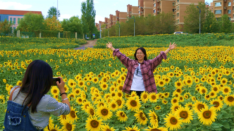 9月21日,克拉瑪依區綠色康城口袋公園的向日葵花海,兩位大學生正在拍照留念。 周建玲攝