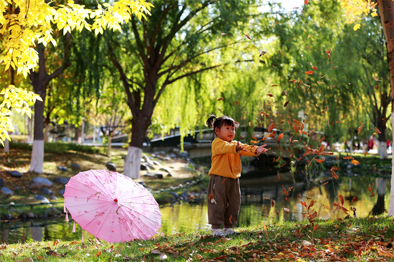 10月10日,一名兒童在世紀公園中與落葉“交朋友”。譚克攝