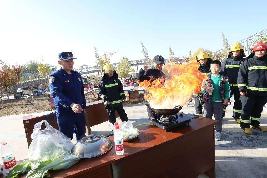 圖為阿克蘇地區消防救援支隊宣傳人員給市民展示油鍋起火消防科普實驗。汪渝供圖